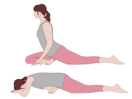 難易度の低いめの上のイラストの様な鳩のポーズもなんとなくはポーズはできるけど股関節の詰まり感や、骨盤周りがしんどい、前屈体勢も長時間がやめてぇ~って人もおられるかもしれないですね。