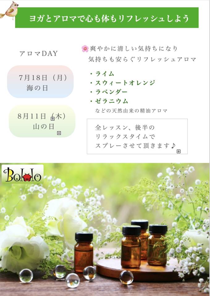 ヨガスタジオぼっこでは、少しでも心地良く快適にヨガを楽しんでいただけるように“アロマヨガDAY”を開催します♪