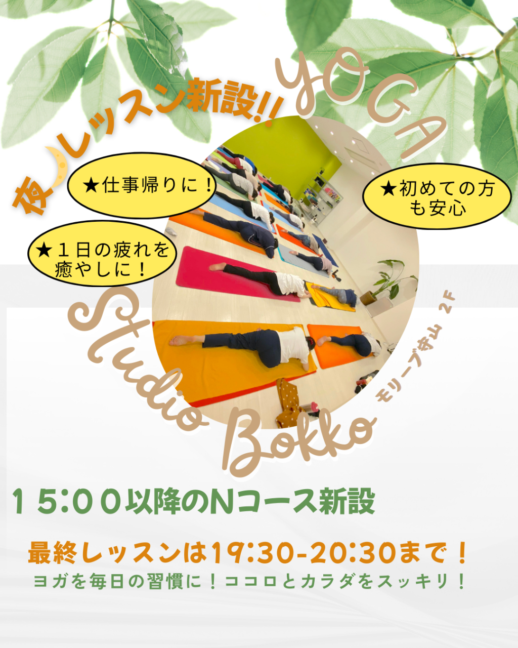 守山市モリーブ2階のヨガスタジオぼっこは、毎日ヨガを6レッスン開講しています!!