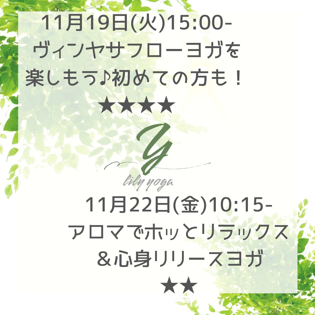 またアロマには、ホルモンバランスを整える、免疫力を高める、消毒・殺菌作用、鎮静作用など、幅広い効果、また美肌やダイエット効果などもあります。これらの成分をヨガで、呼吸と共に体内に取り入れ、心身共に温かい冬を迎えましょう!